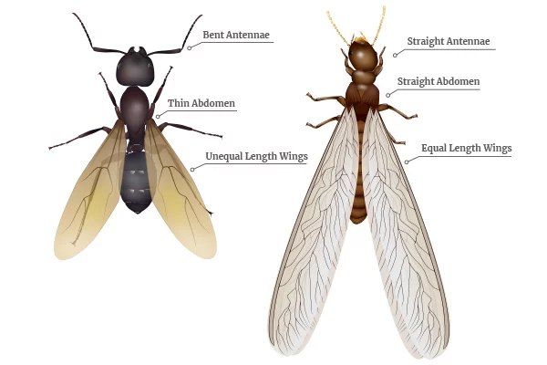 Carpenter ants and termites are often mistaken for one another. That’s because they have similar behaviors (both tunnel in wood, both cause damage to structures, both swarm in order to start new colonies, etc.). If you’ve notice a swarm of flying insects inside your structure or outside and are wondering what type of insect it is, see the differences between winged termites and flying ants in the illustration below.